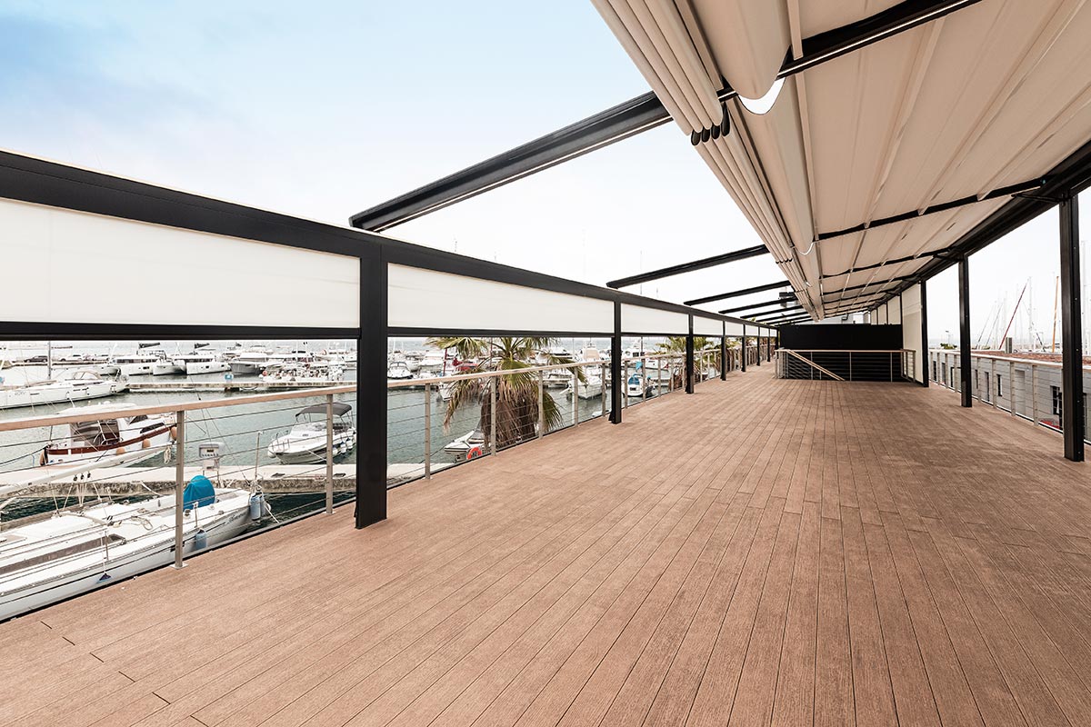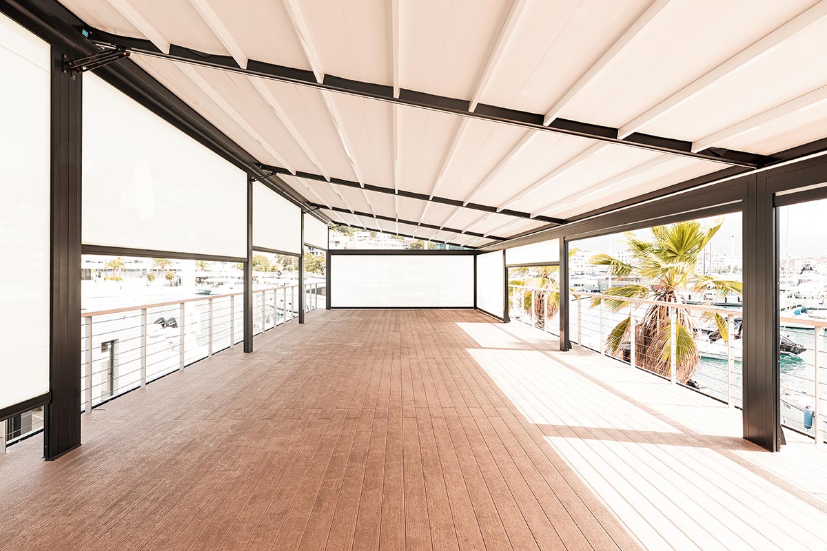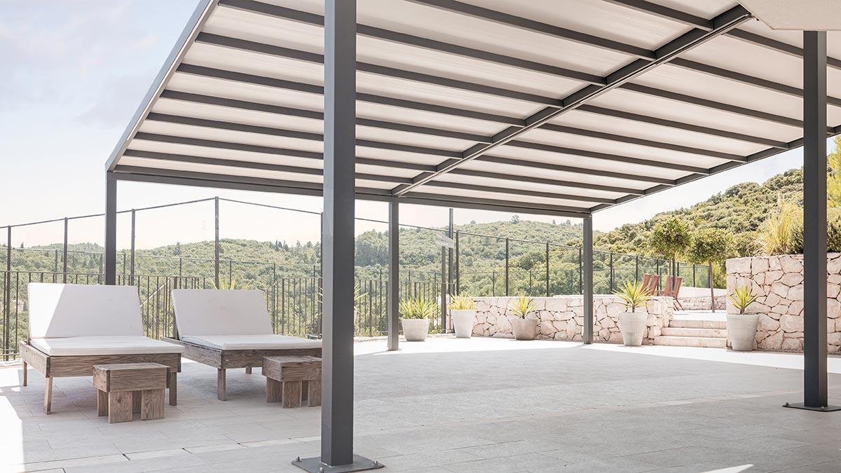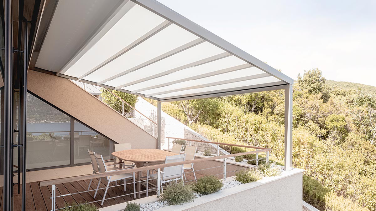 Dezent, robust und ein Höchstmaß an Eleganz. Die Pergola SINTESI ist ein innovatives Modell mit präziser und zuverlässiger Tuchführung, welches im ausgefahrenen Zustand die Leichtigkeit des Designs mit den hervorragenden Eigenschaften des Tuches vereint. Die Tuchführung verläuft innerhalb der Führungsschienen und die Mechanik verschwindet dadurch in der besonders schlanken Struktur. Das ist Ästhetik pur mit praktischen Vorteilen: Das eingefahrene Dach benötigt um 20 Prozent weniger Platz als bei herkömmlichen Konstruktionen.