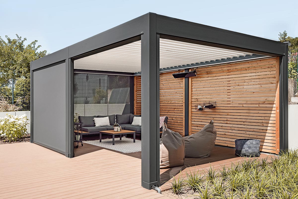 VENTUR ist die bioklimatische Pergola mit beweglichen Aluminiumlamellen und einem waagrechten Dach. Geschlossen bilden die Lamellen einen optimalen Regenschutz. Durch die Öffnung des Daches entsteht zusätzlich zum Schatten ein kühlender Luftzug. Somit wird die Terrasse auch an heißen Sommertagen zur Wohlfühloase. Optional sorgt eine dimmbare LED-Beleuchtung in den Abendstunden für ein angenehmes Stimmungslicht. Mit der vertikalen Beschattung VENTUR SIDE kann die Pergola an den Seiten geschlossen werden.
