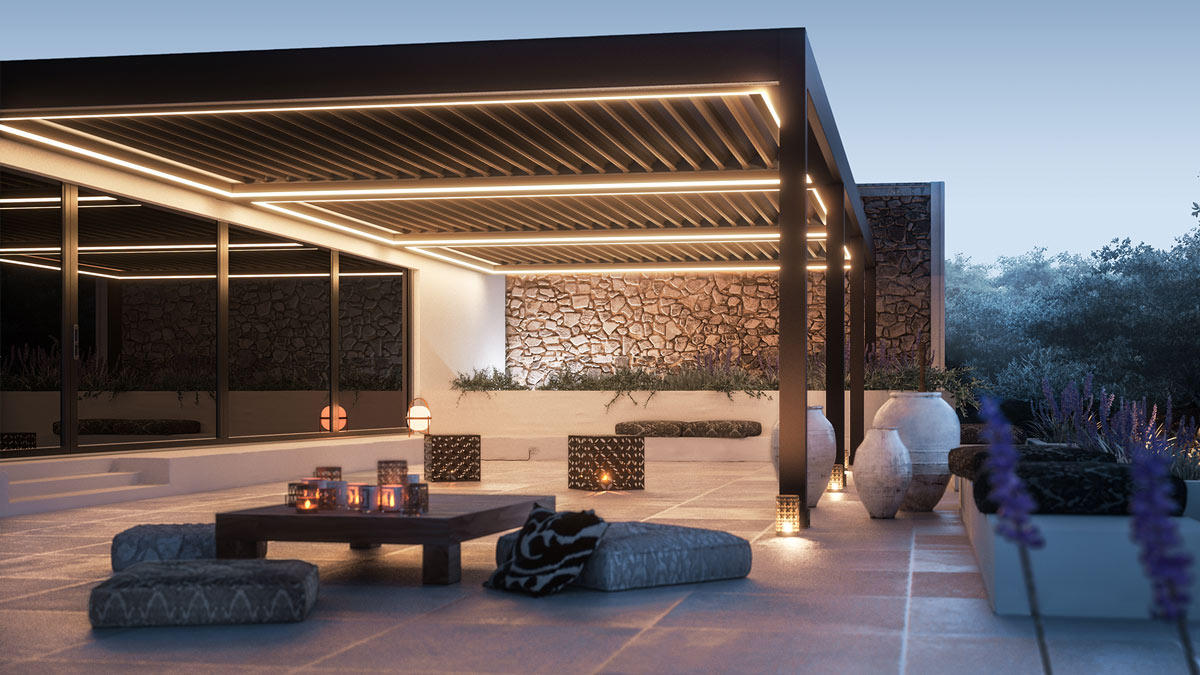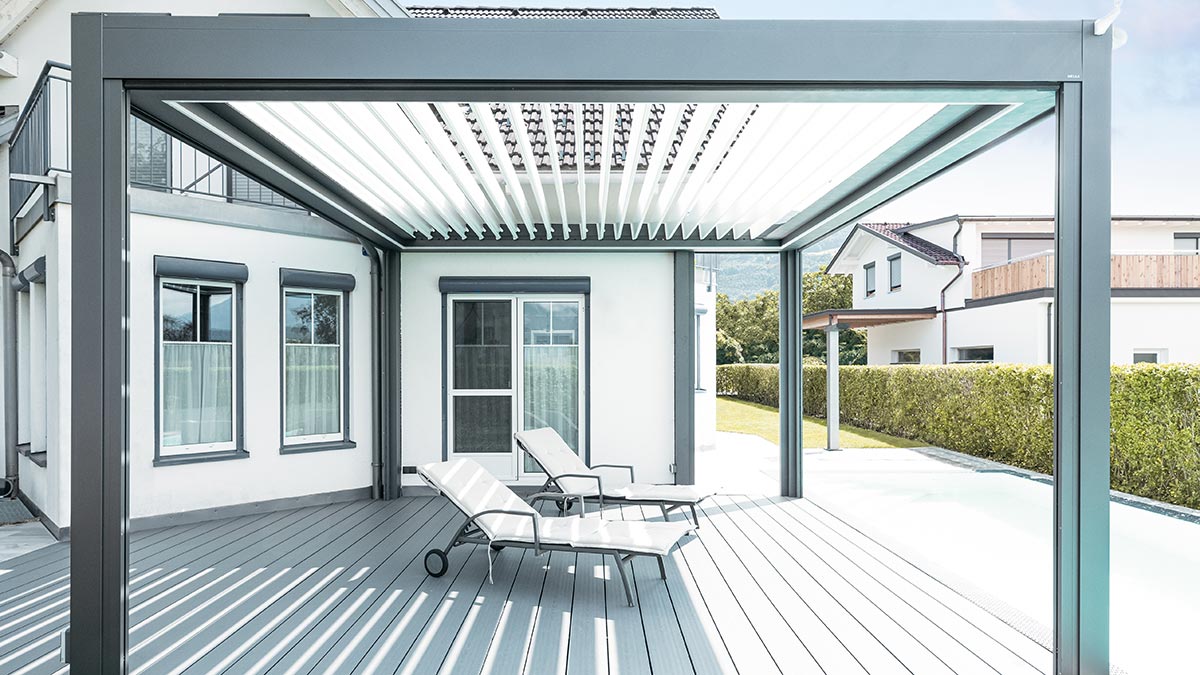 VENTUR ist die bioklimatische Pergola mit beweglichen Aluminiumlamellen und einem waagrechten Dach. Geschlossen bilden die Lamellen einen optimalen Regenschutz. Durch die Öffnung des Daches entsteht zusätzlich zum Schatten ein kühlender Luftzug. Somit wird die Terrasse auch an heißen Sommertagen zur Wohlfühloase. Optional sorgt eine dimmbare LED-Beleuchtung in den Abendstunden für ein angenehmes Stimmungslicht. Mit der vertikalen Beschattung VENTUR SIDE kann die Pergola an den Seiten geschlossen werden.